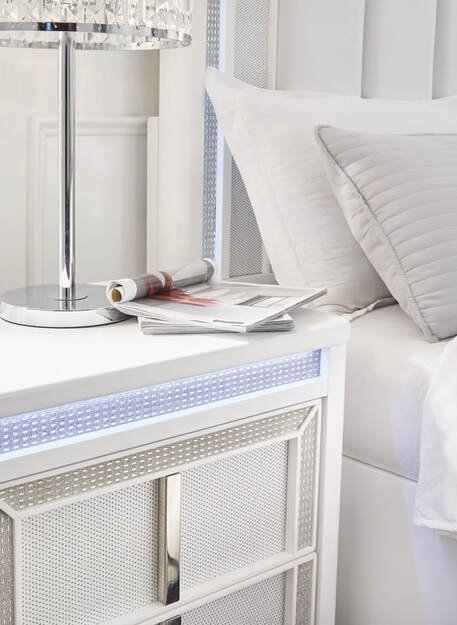 The built-in LED lighting and rhinestone-framed drawers add style and practical storage.